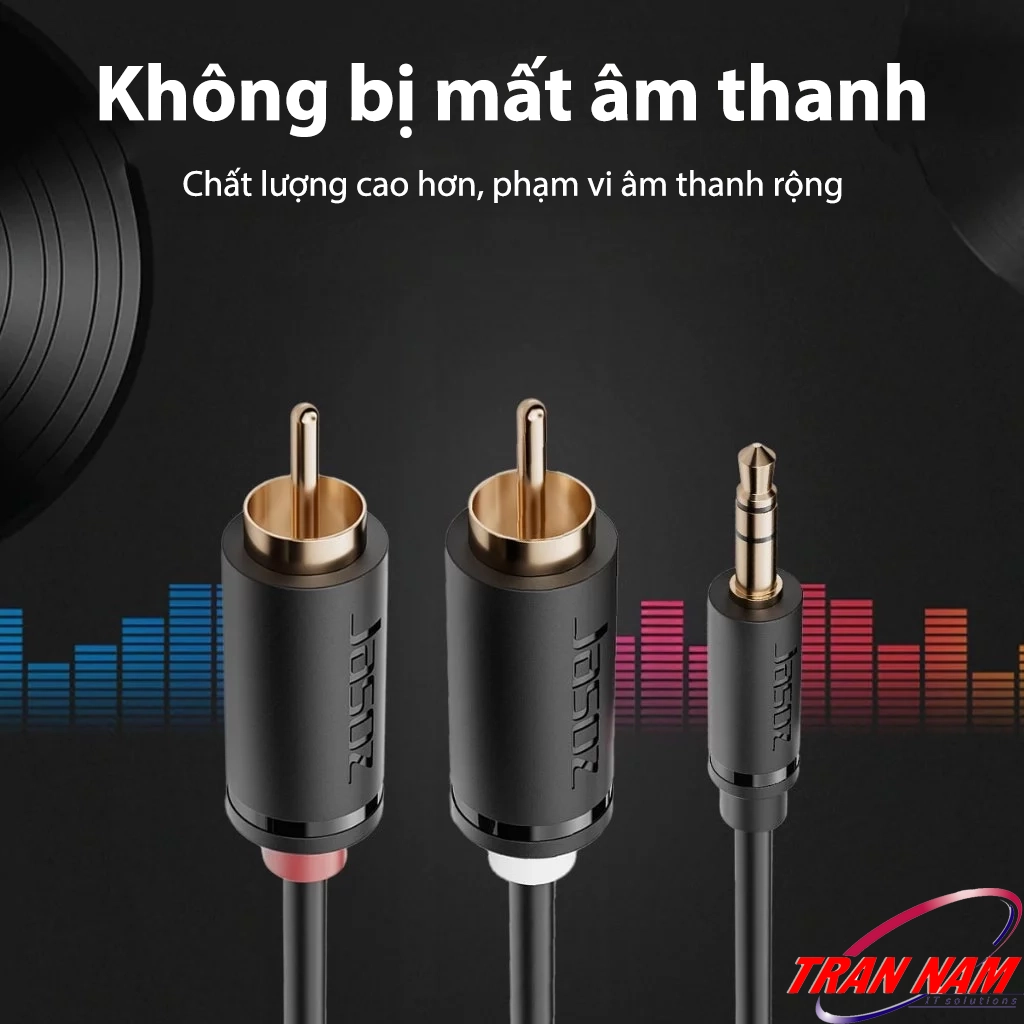 Cáp Audio 3.5mm sang 2 RCA Jasoz C104 – thiết kế đầu cắm mạ vàng chống oxy hóa, lõi đồng nguyên chất, mang lại âm thanh rõ ràng và ổn định trong mọi môi trường sử dụng.