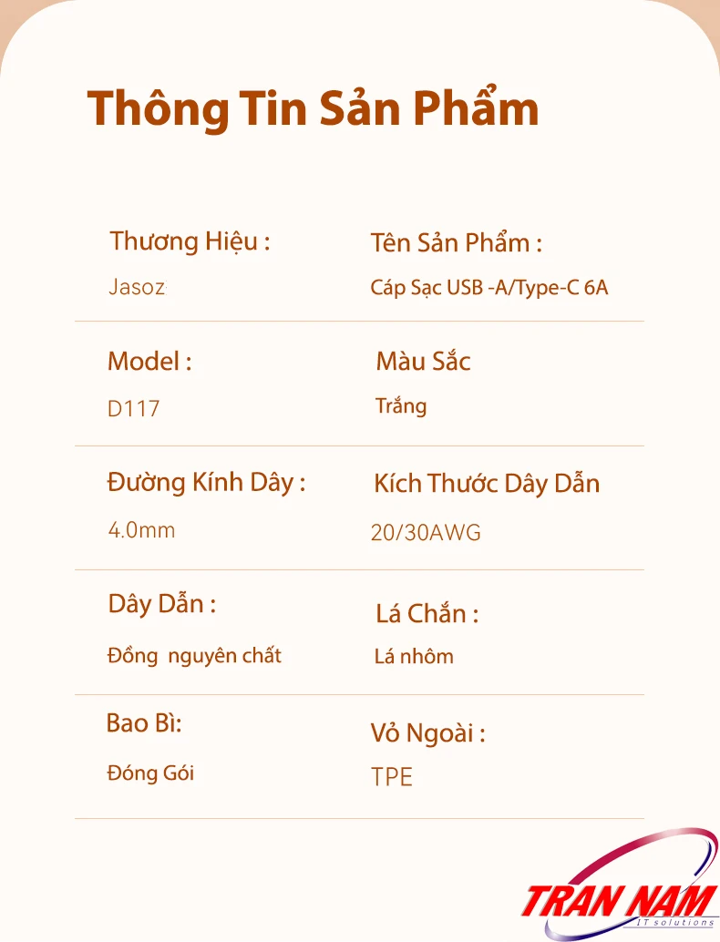 Với thiết kế Lõi đồng nguyên chấtgiúp giảm hao hụt điện năng, duy trì tốc độ sạc cao. Đường kính dây OD 4.0mm giúp tín hiệu ổn định, không nóng khi sạc lâu.Vỏ ngoài được làm từ nhựa TPE mềm dẻo giúpJasoz D117 có độ đàn hồi cao, chịu được uốn cong hàng ngàn lần mà không gãy, thích hợp cho người dùng thường xuyên cuộn dây mang theo kết hợp cùng thiết kế màu trắng thanh lịch sẽ trông sang trọng hơn phù hợp cho cả môi trường văn phòng lẫn sử dụng cá nhân