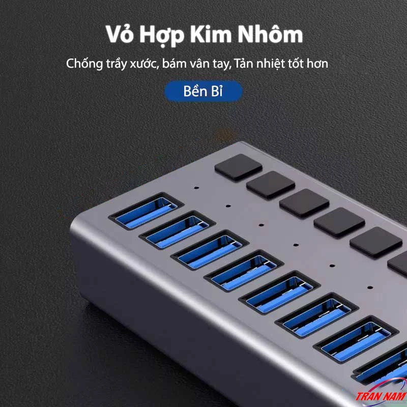Hub USB 3.0 T-F165 là bộ chia USB 10 cổng có công tắc riêng biệt: Cho phép bạn kết nối cùng lúc nhiều thiết bị ngoại vi như chuột, bàn phím, ổ cứng rời, USB… mỗi cổng có công tắc bật/tắt độc lập, giúp kiểm soát linh hoạt và tiết kiệm điện năng.
