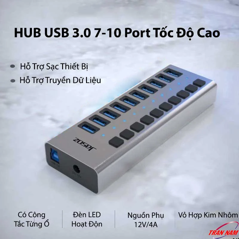 Hub USB 3.0 Jasoz T-F165 là bộ chia USB 10 cổng cao cấp tích hợp công tắc riêng cho từng cổng và nguồn phụ 12V/4A mạnh mẽ, vừa hỗ trợ truyền dữ liệu tốc độ cao 5Gbps vừa có thể sạc nhanh thiết bị di động chuẩn BC 1.2. Đây là giải pháp hoàn hảo cho văn phòng, gaming hay studio sáng tạo nội dung.