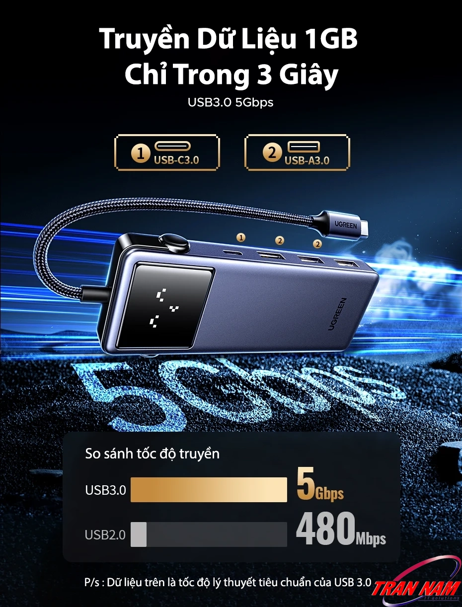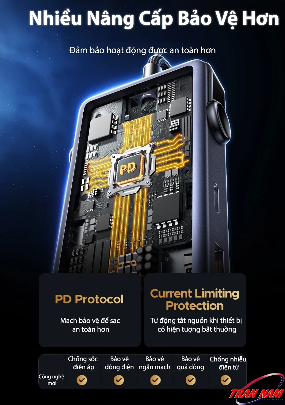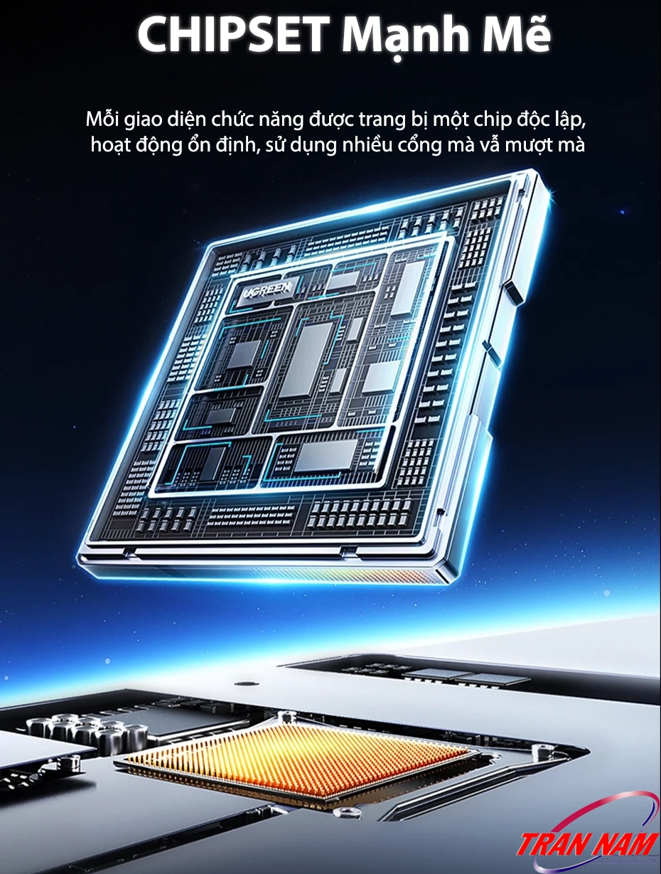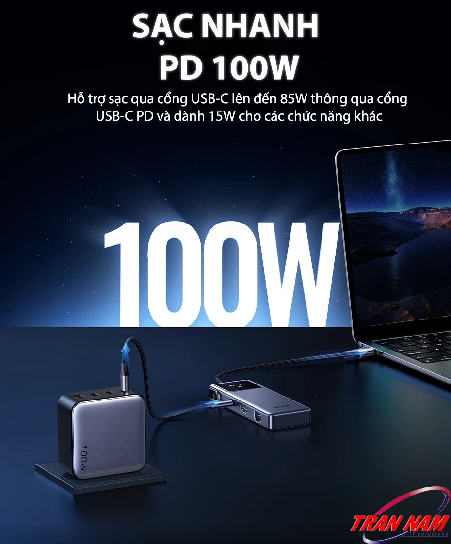 Cổng USB-C PD của Ugreen 45155 hỗ trợ công suất tối đa 100W (thực tế 85W cho laptop), đủ để sạc MacBook Pro, Dell XPS hay ASUS ZenBook trong khi vẫn cấp điện cho các cổng còn lại.Chip quản lý điện năng tự động phân phối nguồn giúp duy trì điện áp ổn định, chống quá nhiệt và quá tải.