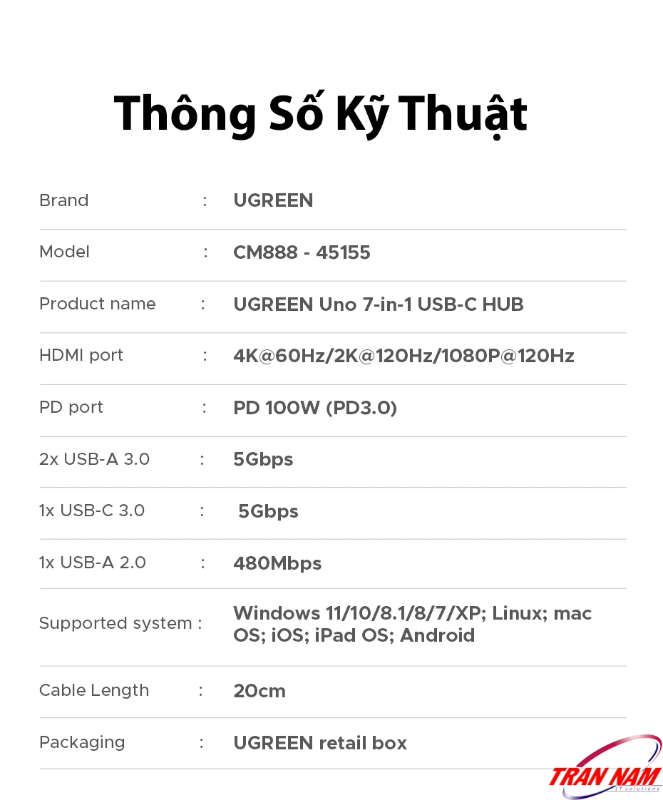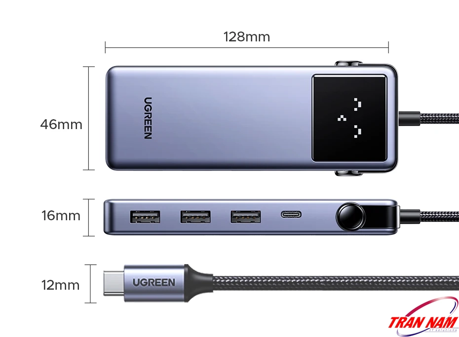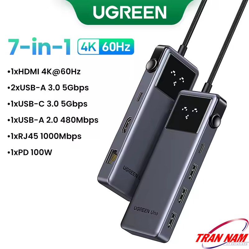 Hub USB-C 7-in-1 Ugreen 45155 là bộ chuyển đổi mở rộng cổng thế hệ mới, được thiết kế để biến một cổng USB-C duy nhất trên laptop thành bộ kết nối đầy đủ cho công việc hiện đại. Sản phẩm tích hợp HDMI 4K@60Hz, LAN Gigabit Ethernet, 2 cổng USB 3.0 5Gbps, USB-C Data, USB 2.0, và sạc nhanh PD 100W, giúp bạn vừa xuất màn hình, vừa truyền dữ liệu tốc độ cao, vừa sạc thiết bị cùng lúc.
