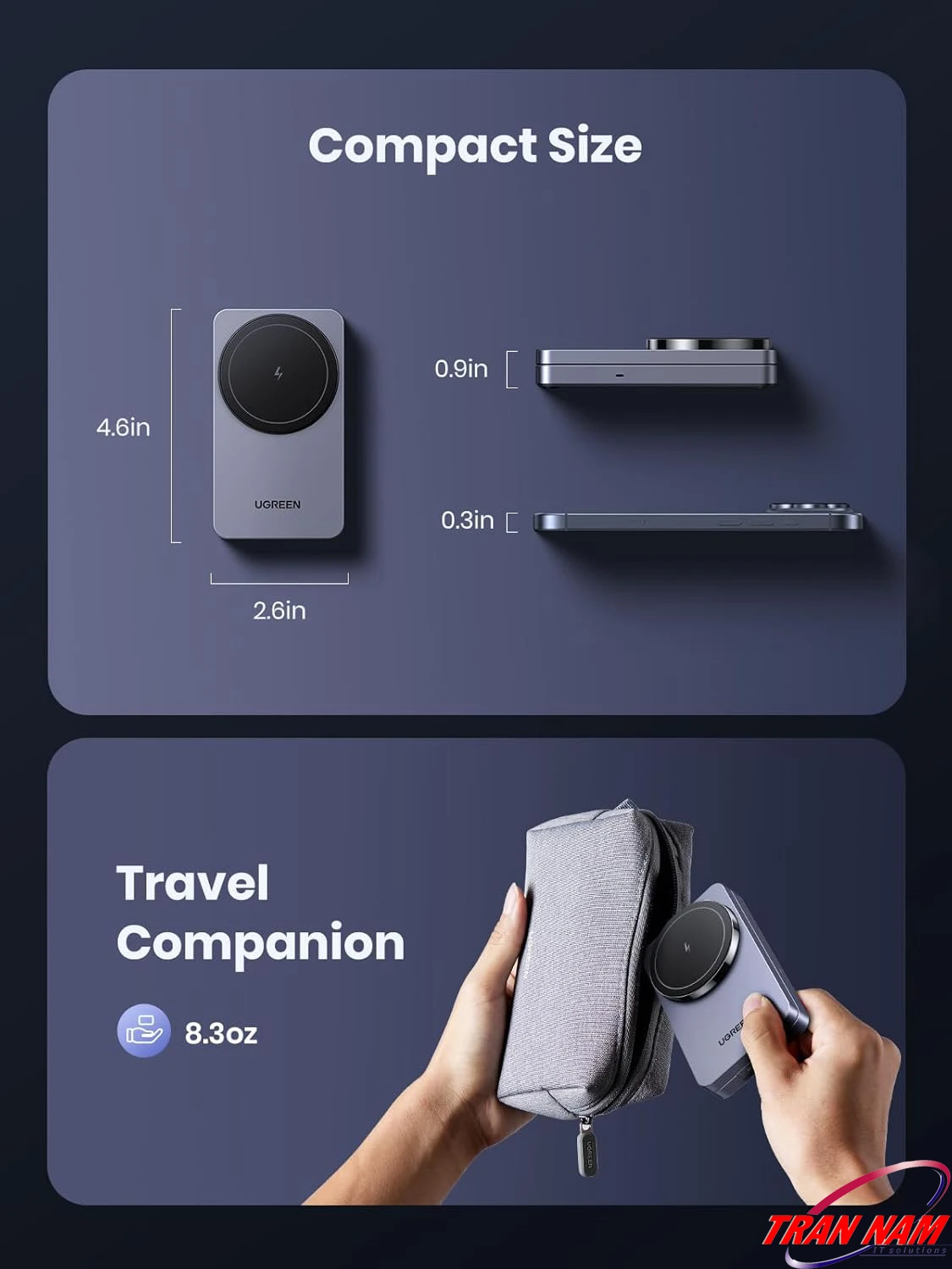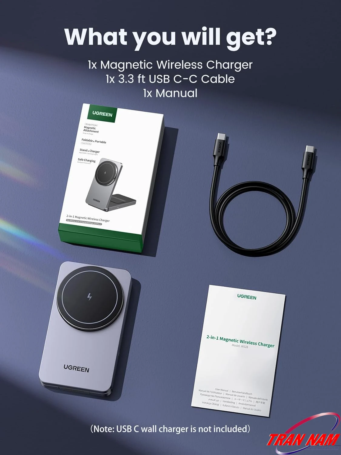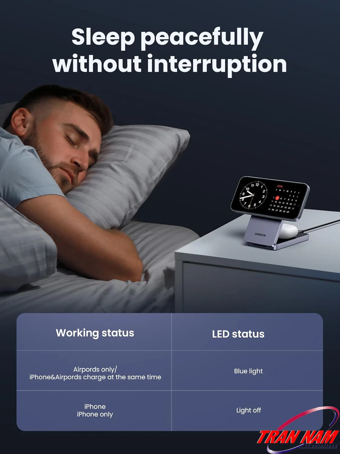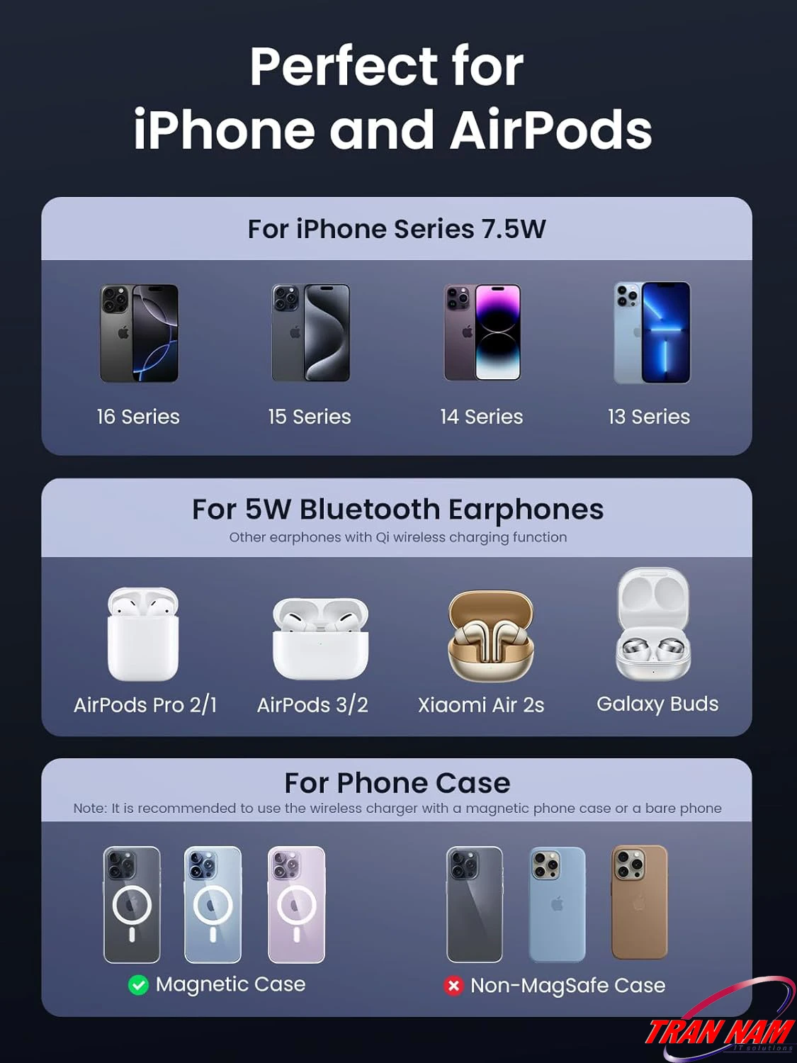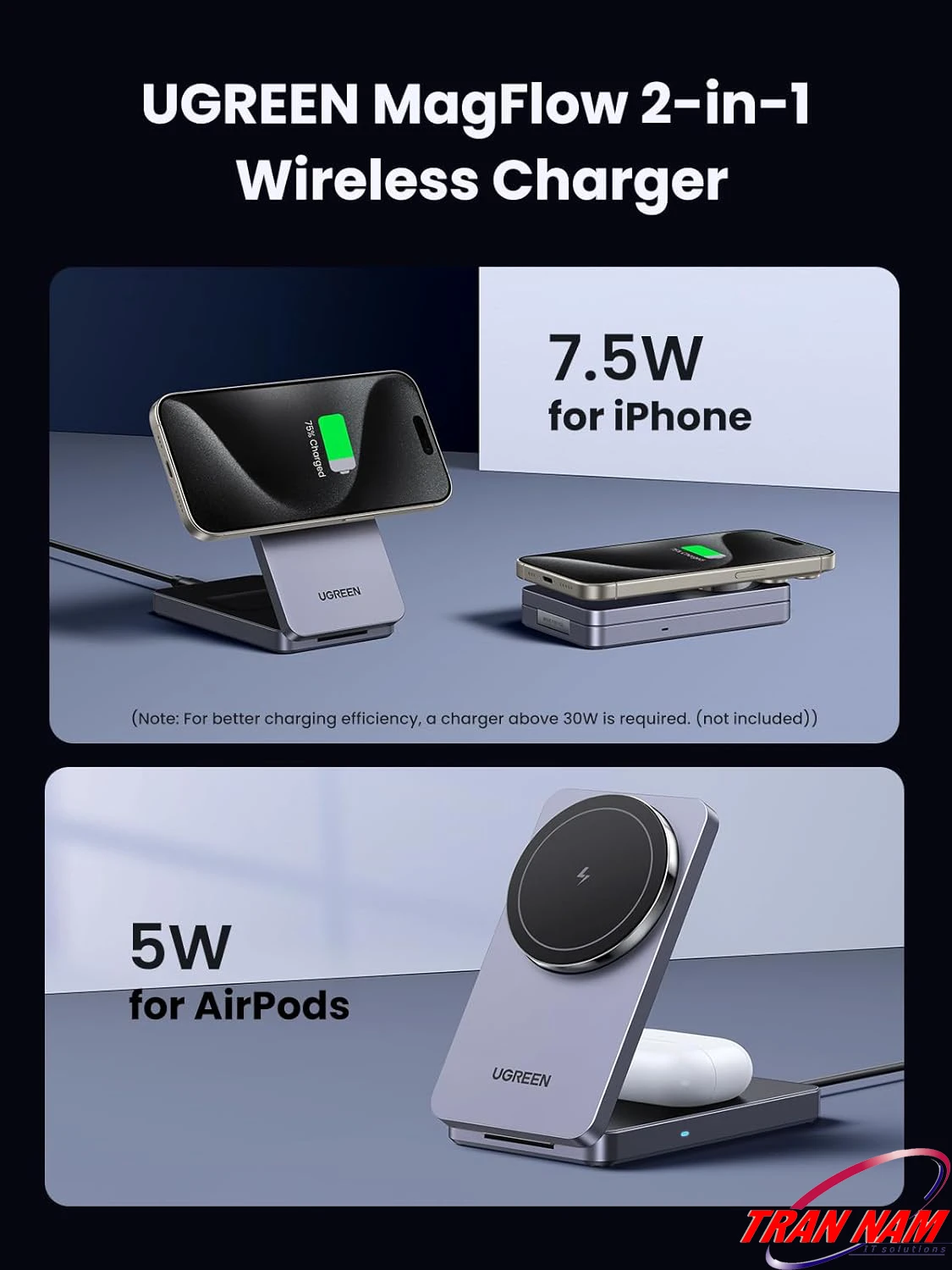 UGREEN MagFlow 2‑in‑1 Wireless Charger cho phép dựng iPhone trên đế từ tính để sạc 7.5W hoặc gập phẳng đặt ngang, trong khi pad dưới sạc AirPods ở công suất 5W, tạo thành trạm sạc 2‑trong‑1 gọn gàng trên bàn làm việc hay tủ đầu giường (nên kết hợp adapter USB‑C ≥ 30W, không kèm theo).Biểu đồ cạnh bên thể hiện đế sạc UGREEN MagFlow 2‑in‑1 có thể gập từ 0° đến 70°, giúp người dùng chọn góc lý tưởng để xem video, gọi FaceTime hay kích hoạt chế độ StandBy trên iPhone trong khi vẫn sạc không dây ổn địnhUGREEN MagFlow 2‑in‑1 Magnetic Wireless Charger hỗ trợ xoay iPhone 360° trên mặt sạc từ tính, cho phép chuyển nhanh giữa chế độ dọc để lướt mạng xã hội và chế độ ngang để xem phim, tập luyện hay dùng StandBy mà không cần tháo máy khỏi đế sạc.UGREEN MagFlow 2‑in‑1 cho phép dựng iPhone trên pad từ tính trong khi AirPods sạc ở bệ dưới, mọi thứ kết nối bằng một cáp USB‑C gọn gàng; mặt đáy đế được phủ silicone chống trượt và thêm lõi kim loại bên trong giúp trạm sạc đứng vững trong quá trình sử dụng.Visual thể hiện cụm nam châm N52*18 mạnh mẽ của UGREEN MagFlow giúp iPhone tự căn chỉnh chính xác vị trí MagSafe, kèm bảng so sánh ốp Magnetic Case được khuyến nghị và Non‑Magnetic Case bị hạn chế, cùng lưu ý nên dùng ốp MagSafe hoặc điện thoại không ốp để đạt tốc độ sạc và độ bám tốt nhấtHình bên trái cho thấy kích thước thật của UGREEN MagFlow 2‑in‑1 khi gập phẳng so với điện thoại, trong khi khung bên phải thể hiện người dùng cầm trạm sạc và cất gọn vào túi phụ kiện, chứng minh thiết kế 4.6 x 2.6 x 0.9 inch và trọng lượng 8.3oz rất gọn nhẹ, phù hợp mang theo trong balo hay valiUGREEN MagFlow 2‑in‑1 đặt cạnh laptop giúp iPhone vừa sạc, vừa hiển thị đồng hồ và lịch theo chế độ StandBy, đồng thời sạc AirPods ngay dưới chân đế, tạo góc làm việc gọn gàng và hiện đại tại văn phòng, quán cà phê hay sân bayInfographic UGREEN MagFlow Wireless Charger Series giúp người dùng chọn đúng model: các bản Qi2 (35316, 45023) đều hỗ trợ sạc iPhone 15W, AirPods 5W, kèm cáp USB‑C và đạt chuẩn Qi2, trong khi các bản Qi (35278, 45056) giữ công suất 15W nhưng không có chứng nhận Qi2 hoặc cổng mở rộng USB‑C cho Apple Watch tùy từng model