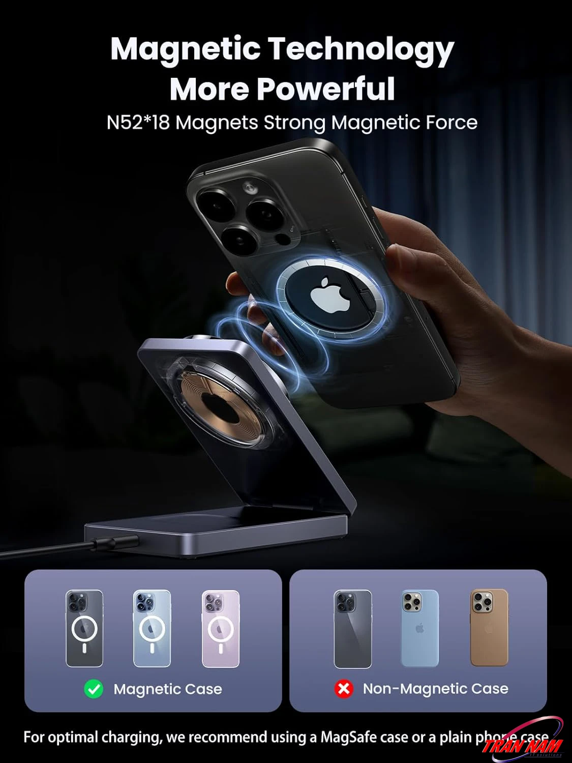 Hiểu đơn giản, bạn chỉ cần đặt iPhone lên bề mặt – nam châm sẽ tự “khóa” đúng vị trí coil sạc, đảm bảo hiệu suất sạc tối đa mà không cần căn chỉnh thủ công.