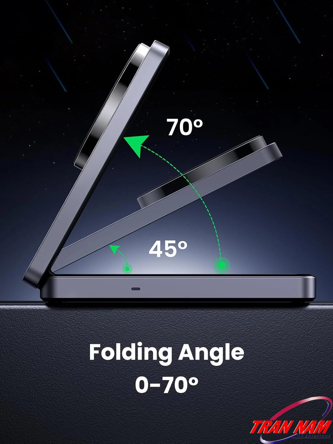 Thiết kế của đế sạc không dây gập gọn MagFlow của Ugreen W528 nhỏ chỉ bằng iPhone 16, có thể gập phẳng để bỏ túi hoặc vali du lịch.Khung hợp kim nhôm tản nhiệt cùng bề mặt silicone mềm chống trượt, giúp cố định điện thoại vững vàng, giảm trầy xước và tản nhiệt hiệu quả khi sạc lâu.So với các đế sạc không dây thông thường, Ugreen 45056 nhỏ gọn hơn 40%, có thể điều chỉnh góc nhìn khi sạc – lý tưởng cho làm việc, xem phim hoặc Facetime.
